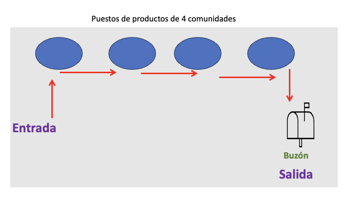 De cualquier forma que sea su espacio, deben considerar como mínimo 4 puestos en donde se expliquen los productos a los visitantes. Pueden ser más, lo ideal es que se organicen por comunidades y cada comunidad se haga cargo del arreglo y los carteles de sus productos.