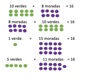 Entonces, vemos que podemos combinar de diversas maneras los dos tipos de uvas (verdes y moradas) y si cuidamos que den 16, todos los resultados serán correctos.