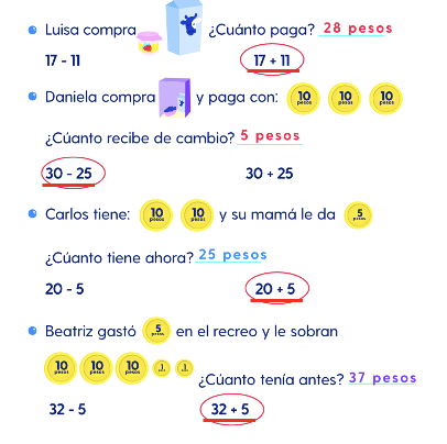 Beatriz gastó 5 pesos, y le sobraron 3 monedas de 10 y 2 monedas de peso. ¿Cuánto tenía antes? 37 pesos