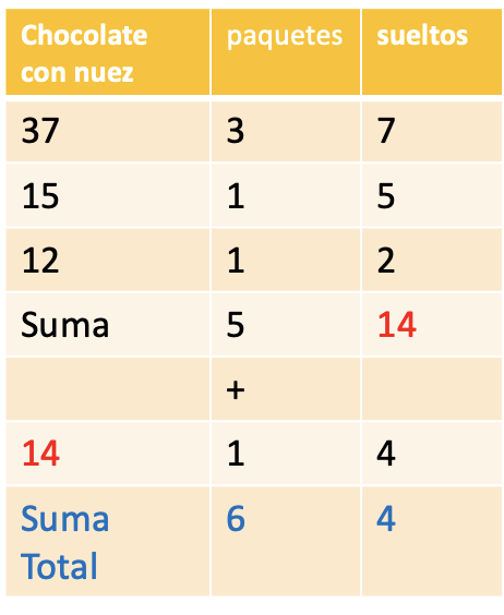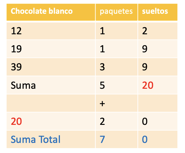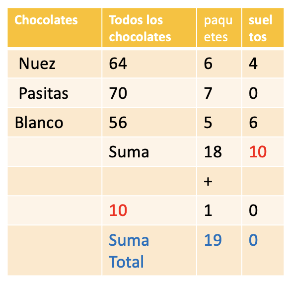 Entonces, quedan 7 paquetes de 10 chocolates y 0 sueltos.