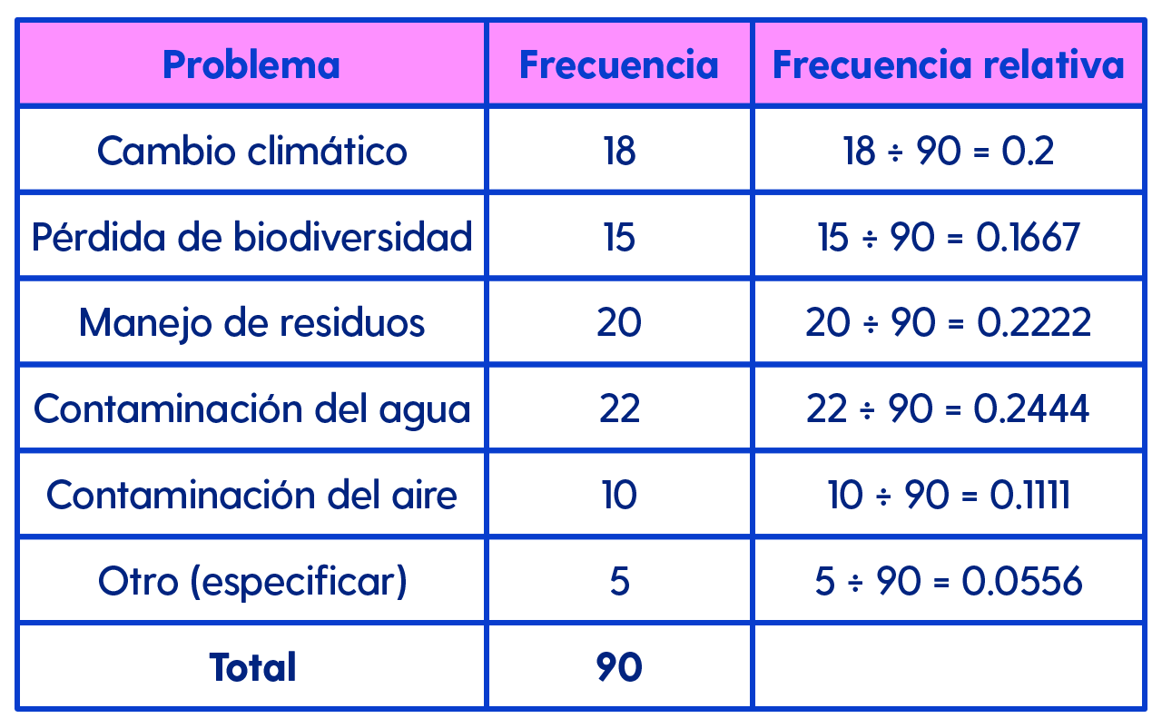 Para realizar el inciso a), vamos a calcular la frecuencia relativa de cada problema ambiental mencionado en la encuesta. La frecuencia relativa se obtiene dividiendo la frecuencia de cada problema por el total de datos recopilados y se expresa normalmente como un decimal o porcentaje.