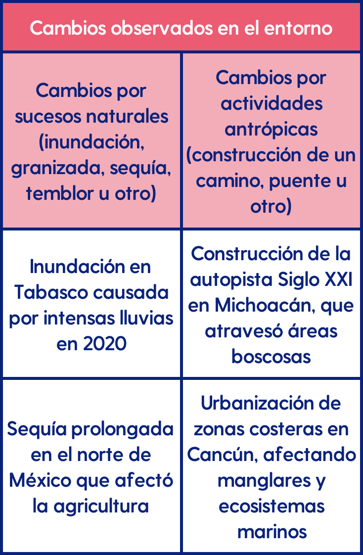 Aquí tienes unos ejemplos que te ayudarán a llenar tu tabla y entiendas mejor sobre los cambios observados en el entorno en diferentes lugares de México: