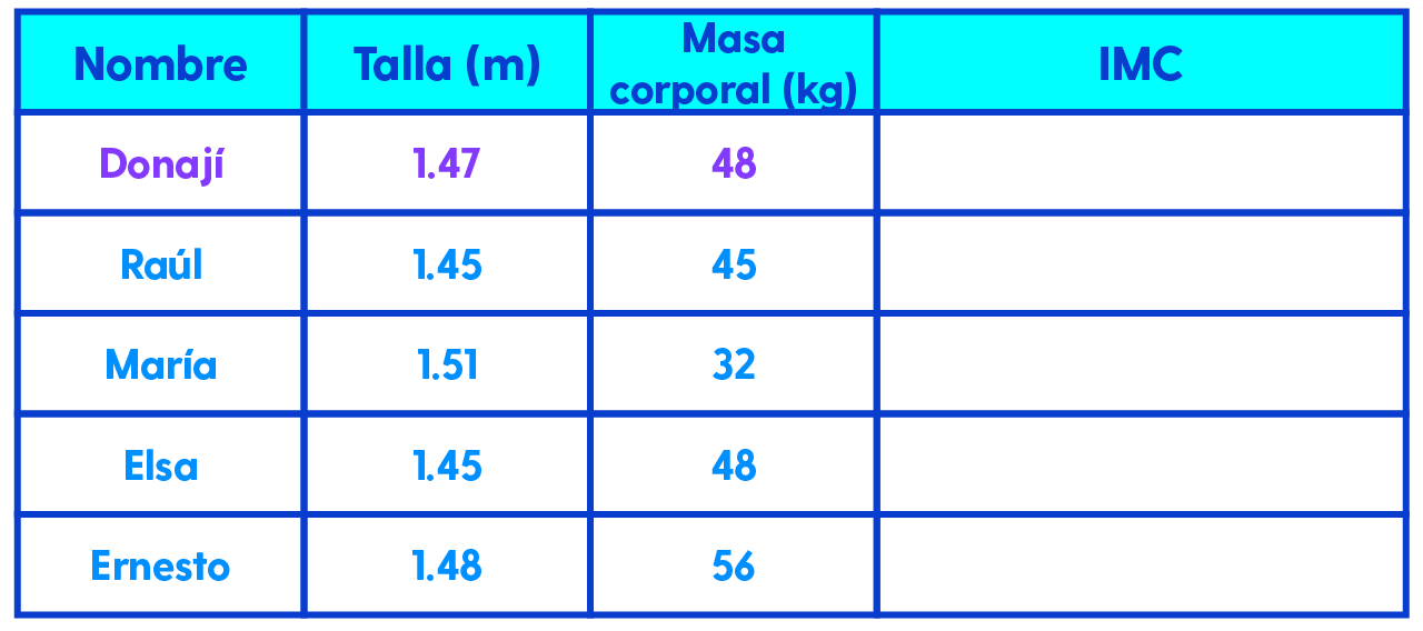 Este es un ejemplo de cómo llenar la tabla con las tallas (alturas o estaturas) y la masa corporal (comúmente peso).