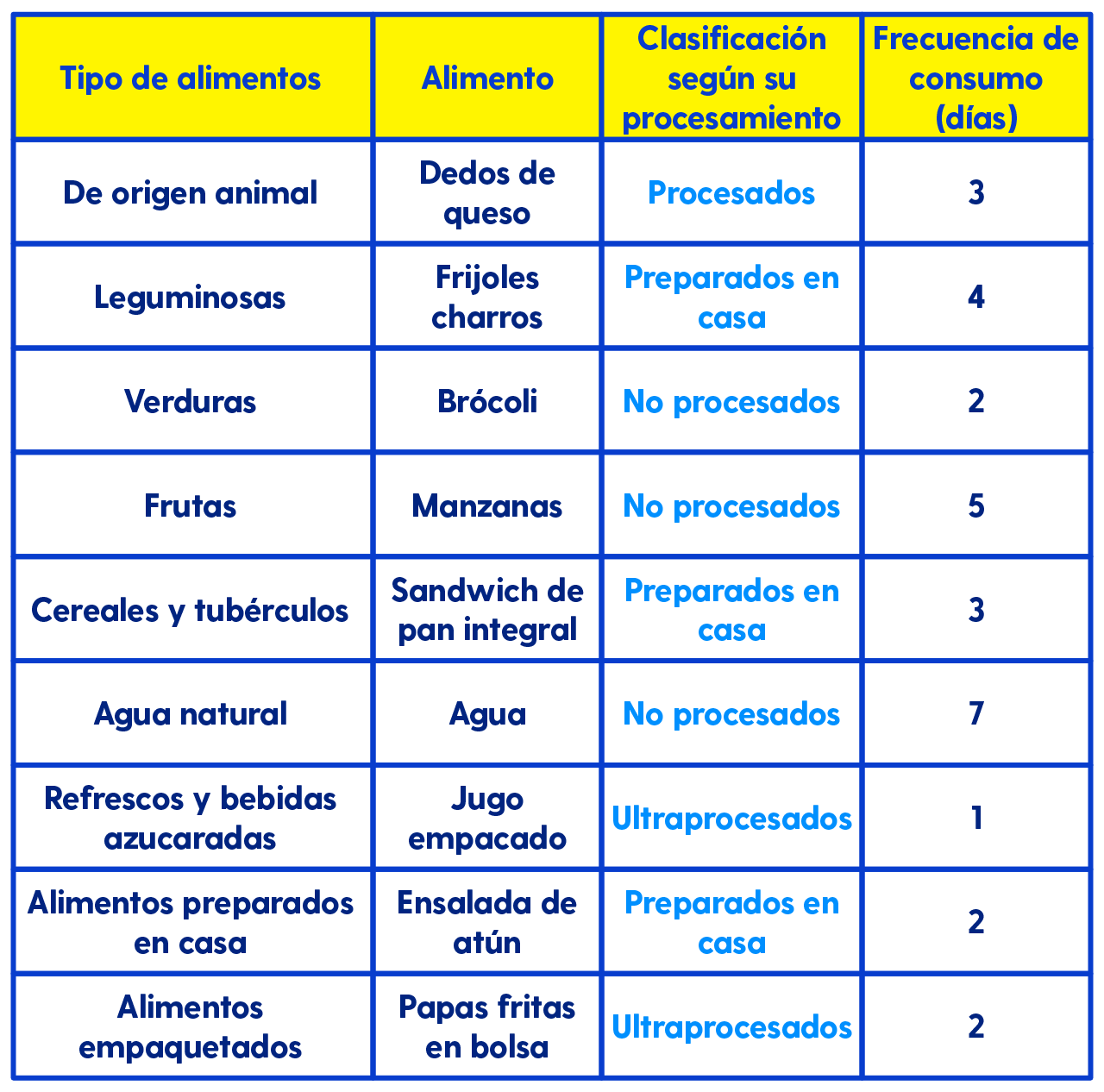 2. En consenso, clasifiquen en su cuaderno los alimentos registrados en las siguientes categorías: alimentos no procesados, alimentos mínimamente procesados, alimentos preparados en casa y alimentos ultra procesados.