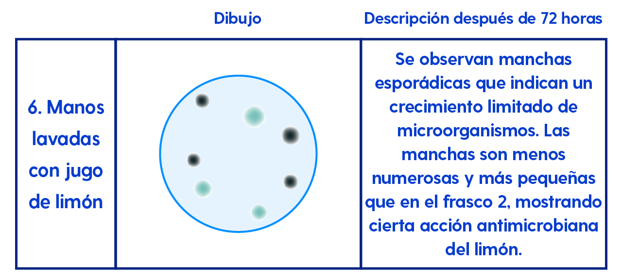 También vi que en otros frascos donde se usó jugo de limón, el crecimiento de microorganismos variaba mucho. Algunos tenían muchas manchas y otros muy pocas. Me pregunto si el tamaño del limón o la cantidad de jugo usado podría influir en esto.