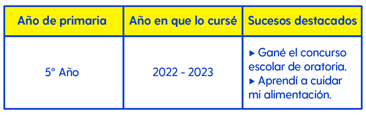 En las demás columnas, los elementos importantes que quieras destacar como quién era tu maestra, amigos y las cosas que aprendiste dentro y fuera de la escuela