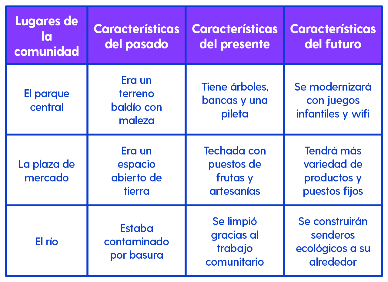 2. De manera comunitaria y siendo solidarios, hagan una lista de las características de su comunidad en el pasado, el presente y el futuro. Consideren que hay una estrecha relación entre cada momento, por lo que es necesario que comenten al respecto y se apoyen de una tabla como la siguiente: