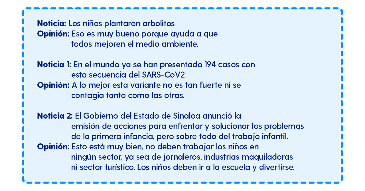 2. De manera individual, pero sin olvidar a los demás, observa el ejemplo. Luego, selecciona dos noticias de tu comunidad y da una opinión sobre ellas en los espacios correspondientes.