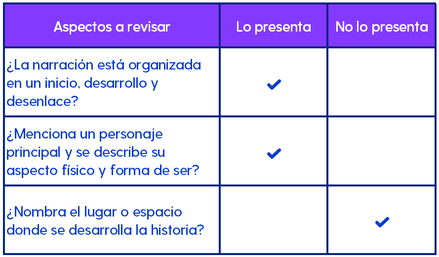 Ahora que has intercambiado tu cuento con un compañero, es importante que ambos lo lean con respeto y den opiniones constructivas. Al revisar la historia de tu compañero, utiliza la siguiente tabla para ver si incluye todos los elementos importantes de un buen cuento.