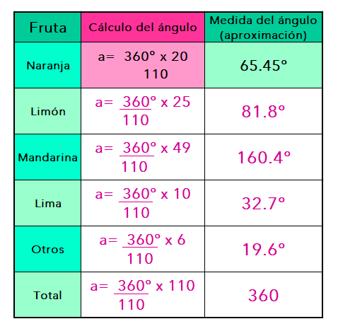 2. Analicen el ejemplo y completen la tabla. Consideren que como los valores del ángulo son aproximados, la suma total también sera una aproximación.