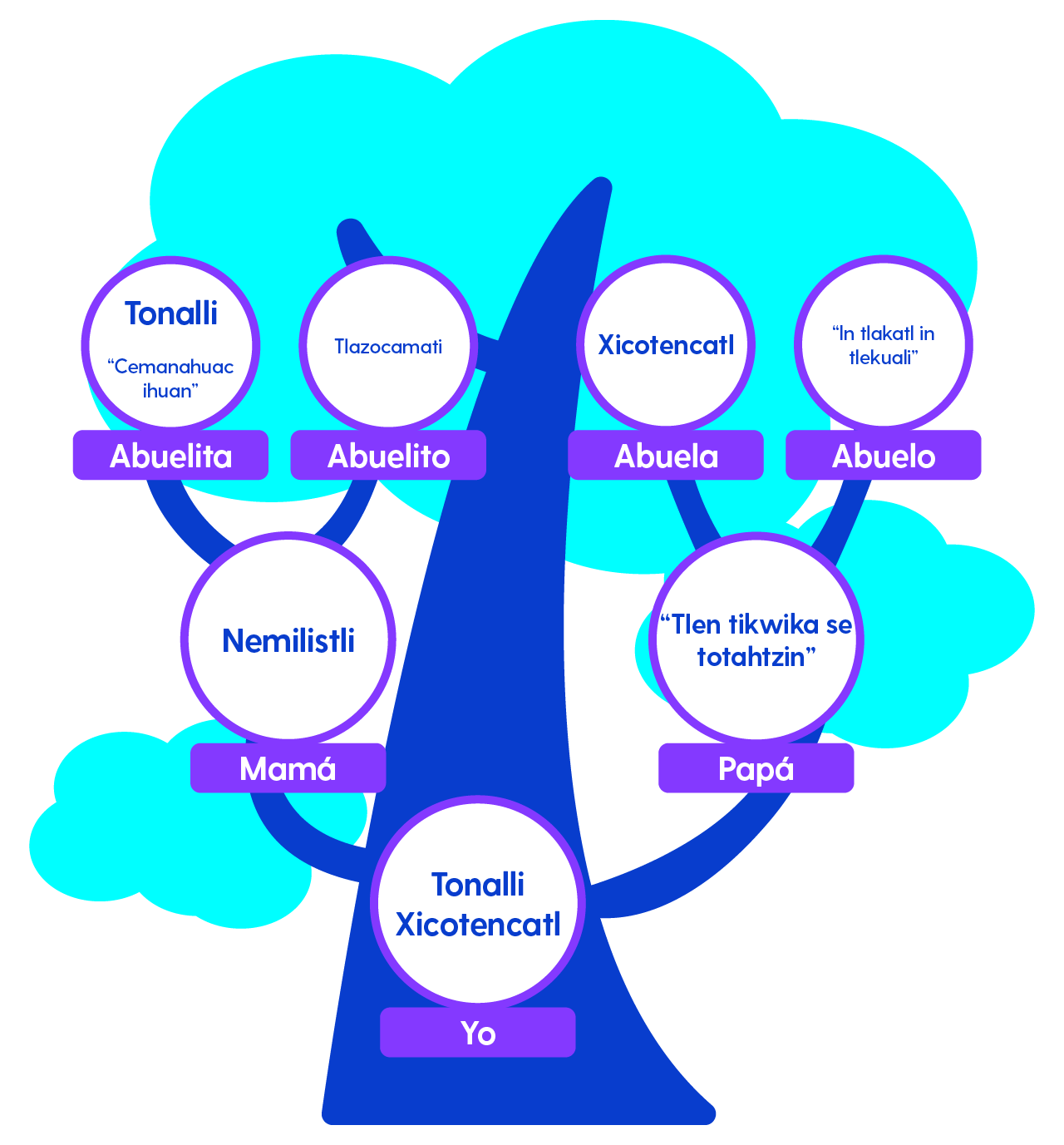 2. Con base en las respuestas obtenidas por parte de tu familiar, diseña un árbol genealógico en una hoja de papel y coloca en él las palabras o frases características de su lengua. Toma como referencia el siguiente modelo: