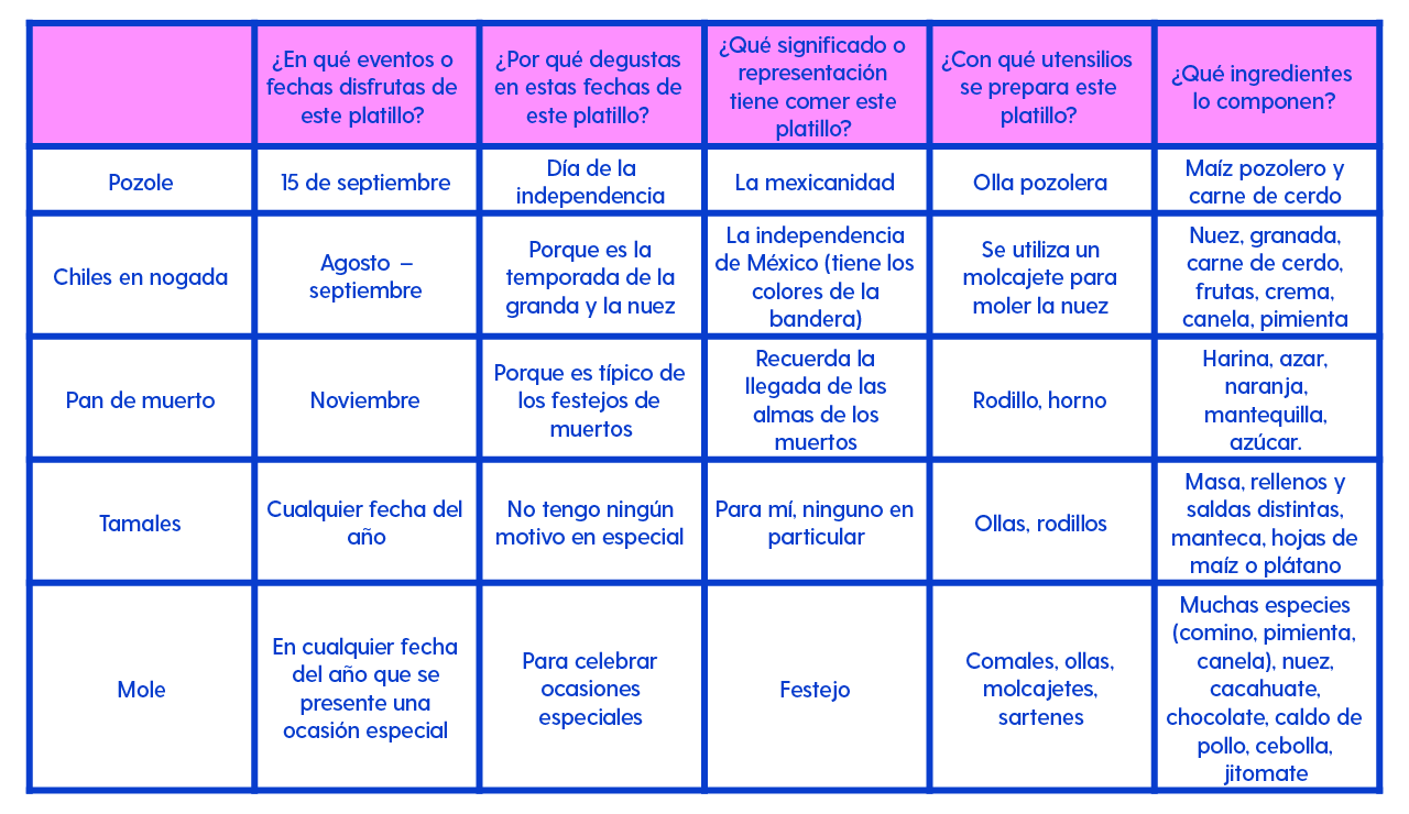1. De manera individual, pero sin olvidar que eres parte de una comunidad, piensa en los platillos que se mencionan a continuación y contesta las siguientes preguntas: