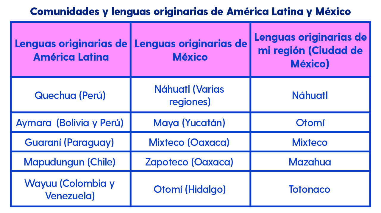 1. Investiguen en diferentes fuentes, como la biblioteca de la comunidad o la Biblioteca Escolar, así como en páginas confiables de internet, para conocer algunas de las lenguas originarias de América Latina, las de México y las que se hablan o se hablaban en su localidad.